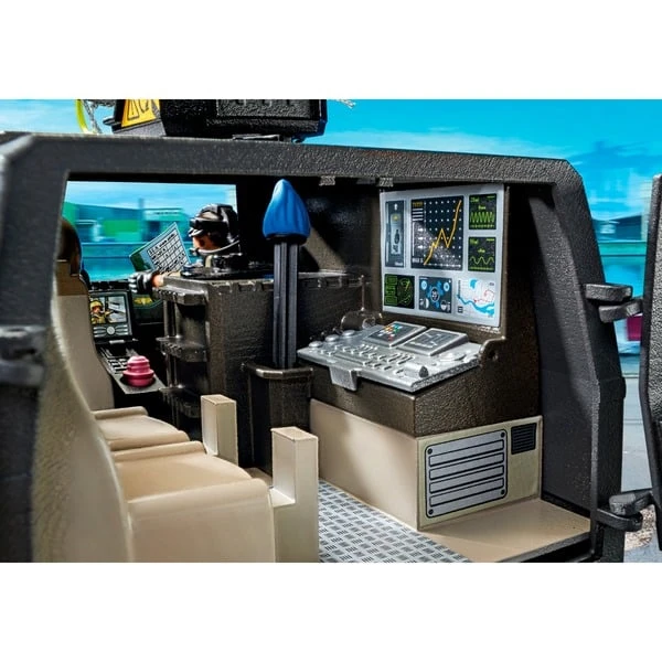 Gegen dieses SEK-Geländefahrzeug aus der PLAYMOBIL-Serie City Action hat kein Übeltäter eine Chance! Es ist dank Allradfederung äußerst geländegängig – und steht etwas im Weg, so lässt sich das Hindernis mit dem höhenverstellbaren Räumaufsatz an der Vorderseite beseitigen. Auf dem Dach ist ein drehbarer, bemannbarer Turm angebracht, mit dem ein Enterhaken oder ein Wasserpfeil verschossen werden kann. Das Fahrzeug beeindruckt mit einem komplett eingerichteten Innenraum, der dank des abnehmbaren Dachs ganz einfach bespielt werden kann. Das vielfältige Zubehör findet in den Schubkästen an der Seite des Fahrzeugs Platz. Eine Warnsirene und ein Lichtsignal auf dem Dach sorgen für eine tolle Sound- und Lichtkulisse. Mit dabei sind außerdem zwei Figuren, die für den nächsten Einsatz bestens ausgerüstet sind. Art.-Nr.: 1888956