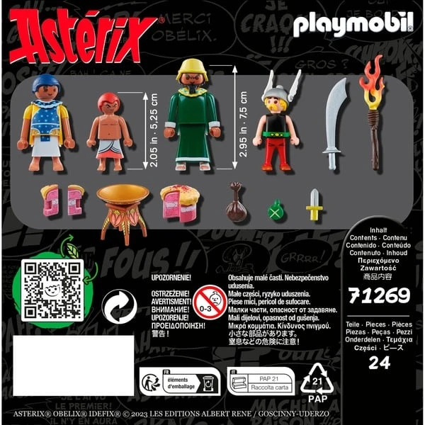 | Inhalt/Ausstattung | Figuren: Asterix, Pyradonis, Schraubzieris, Kleopatras Vorkoster. Zubehör: 1 Tisch, 1 Torte, 2 Kuchenstücke, 1 Messer, 1 Schwert, 1 Fackel, 1 Beutel,1 Trinkflasche, 1 Helm, 1 Hut. | ||