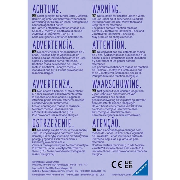 | Nicht geeignet für Kinder unter 7 Jahren. Benutzung unter Aufsicht von Erwachsenen. Anweisung vor Gebrauch lesen, befolgen und nachschlagebereit halten. Die Farben enthalten Reaktionsmasse aus 5-Chlor-2- methyl-2H-isothiazol-3-on und 2-Methyl-2H-isothiazol-3-on (3:1) Kann allergische Reaktionen hervorrufen. | |||